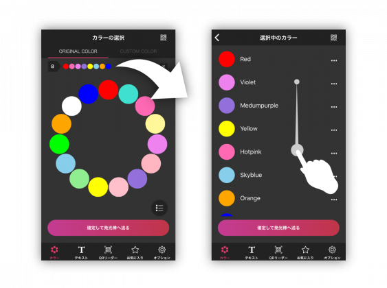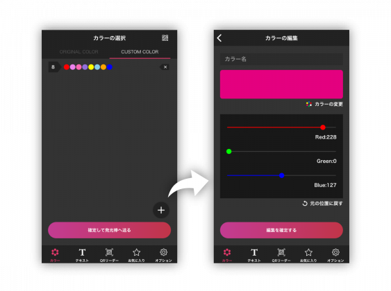 好きなカラーをCUSTOM COLORて作ることができます。Green、Blueのバーを指で左右に動かしてカラー調節を行い、カラー名を入力します。