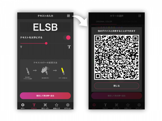 表示させたいテキストを5文字まで入力することができます。入力したテキストや、カラーは右上にあるQRコード生成ボタンを押して他のデバイスと共有することができます。