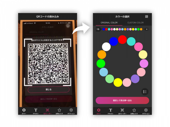下のメニューからQRリーダーを選ぶとカメラが起動します。他のデバイスで生成したQRコードを画面に写すと作成されたカラーやテキストの編集画面が表示されます。